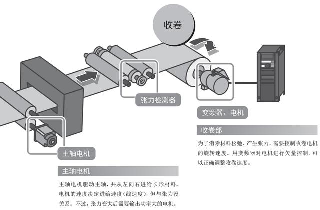 為了消除材料松弛、產(chǎn)生張力,需要控制收卷電機的旋轉(zhuǎn)速度。用變頻器對電機進行矢量控制,可以正確調(diào)整收卷速度。