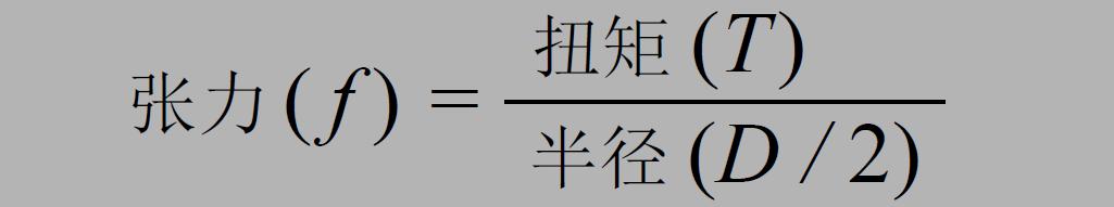 下面說明放卷長形材料時的張力和扭矩的關(guān)系。扭矩是作用于旋轉(zhuǎn)軸的力。放卷長形材料時,卷軸的制動扭矩(制動器扭矩)比電機扭矩更弱,所以材料被向右側(cè)放卷。此時,材料所受到的張力(f) 由較弱一側(cè)的制動扭矩(T)決定, 扭矩(T) 和張力(f)的關(guān)系如下公式所示:
