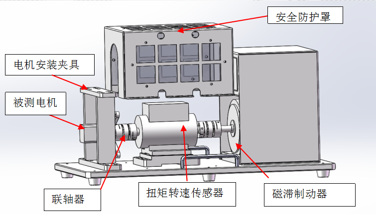 磁滯制動器輸出軸通過高精度彈性聯軸器與扭矩轉速傳感器的一端輸出軸連接,扭矩轉速傳感器另外一端輸出軸通過高精度彈性聯軸器與被測電機的輸出軸連接。安全方面涉及到旋轉部分的裝置全部由金屬+亞克力安全防護罩包裹。測試底板下安裝了6個減震座減小在測試時的振動帶來的測試誤差。