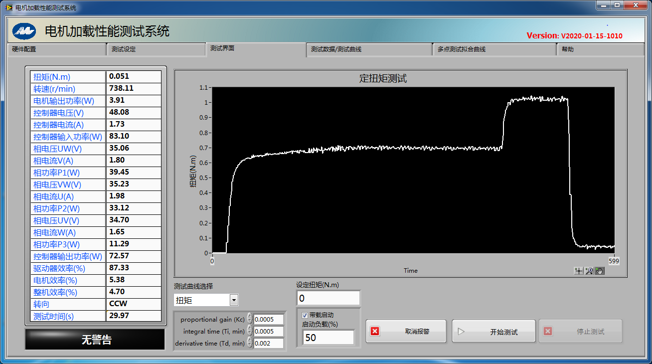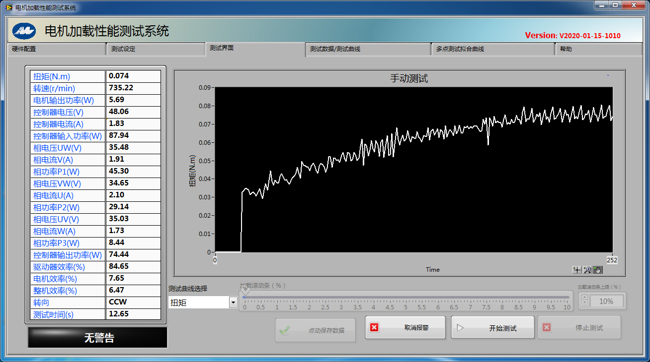 4.測功機加載方式:除傳統手動勵磁加載方式外,本系統具有多種自動加載方式:定勵磁增量加載方式,定轉矩增量加載方式,定轉速增量加載方式,定轉矩加載方式,定轉速加載方式和定斜率加載方式。