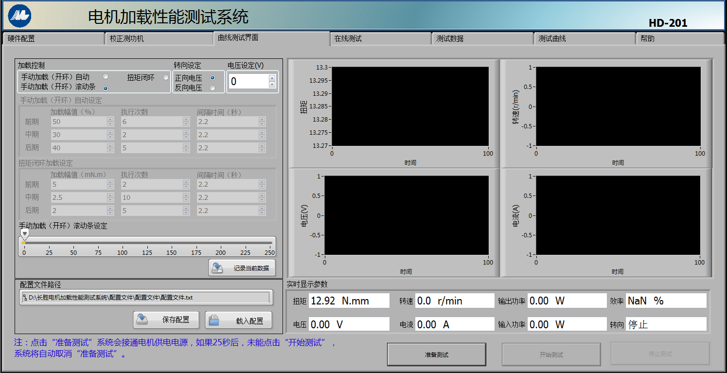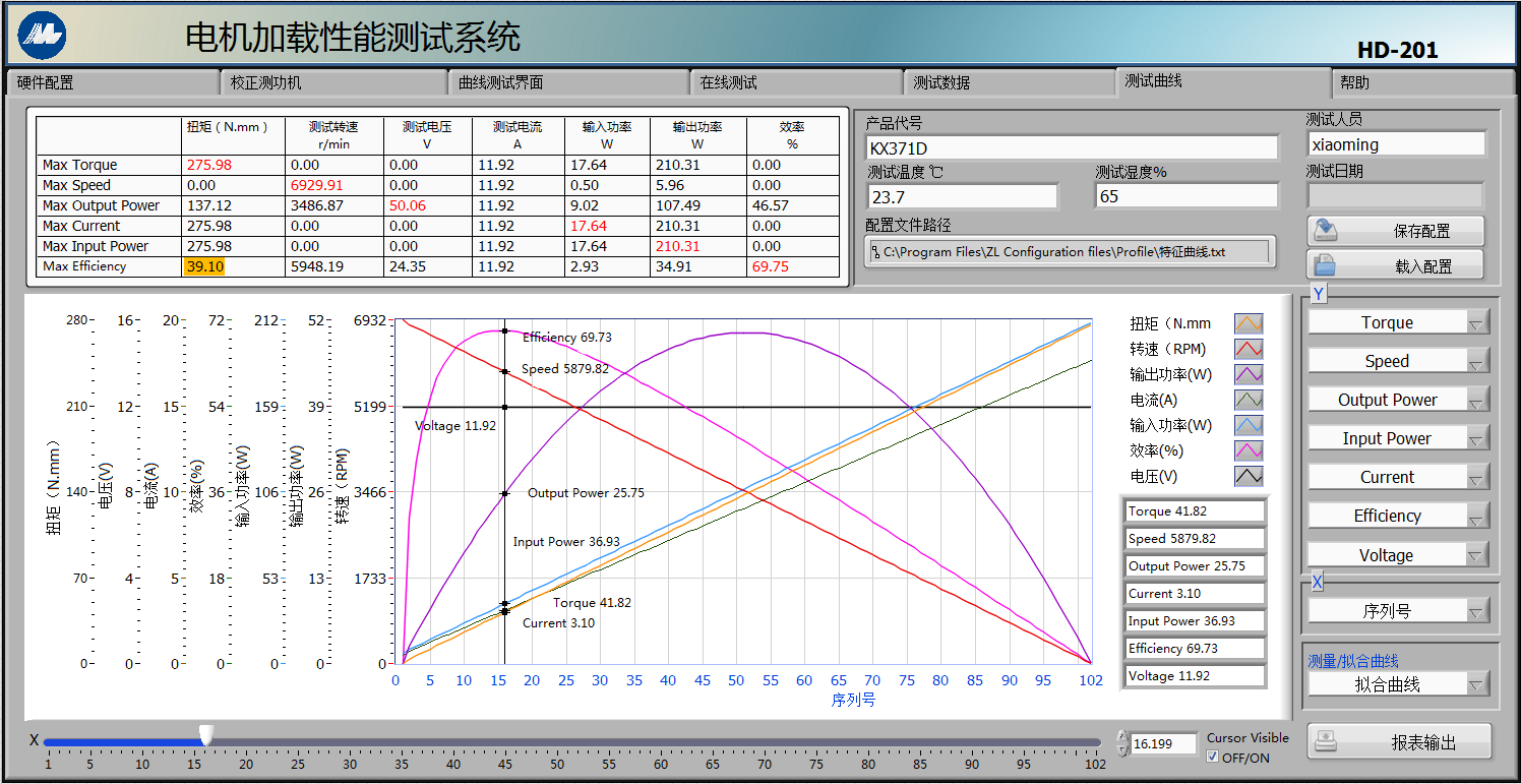 4.測試軟件用LABVIEW編寫,具有特色的測試與圖形繪制功能,可以計(jì)算并顯示多個(gè)參數(shù)(扭矩,轉(zhuǎn)速,輸出功率,電壓,電流,輸入功率,效率,轉(zhuǎn)向等)